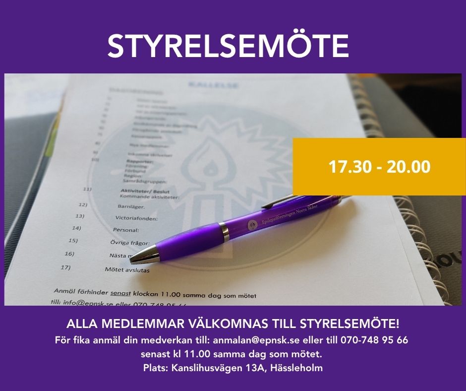 Styrelsemöte 11 maj Epilepsiföreningen Norra Skåne 2026-04-14 Nyheter Våra möten är öppna för alla medlemmar. Om du vill ha fika anmäler du dig via mail till anmalan@epnsk.se eller på telefon 070-748 95 66. Varmt välkommen!Plats: Kanslihusvägen 13A, HässleholmTid: 17.30- ca 20.00InläggsnavigeringFöregående Föregående inlägg: Styrelsemöte 14 aprilNästa Nästa inlägg: Styrelsemöte 8 juni